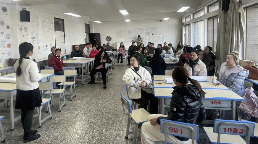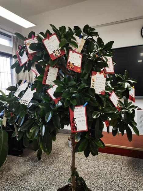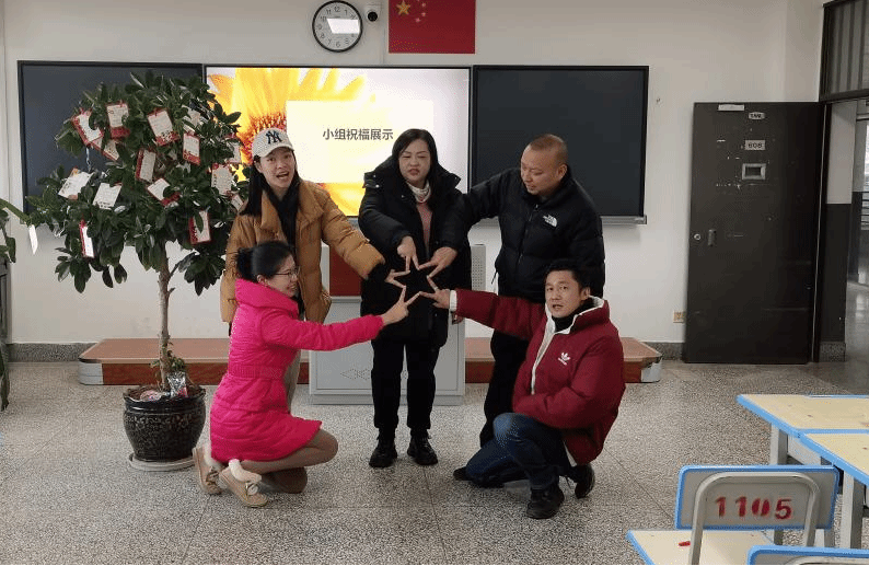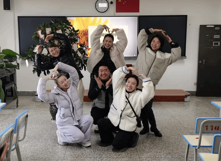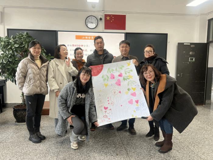 工作坊精心设计了四个循序渐进的体验环节。在“破冰与共创”环节,通过“大风吹”热身活动和小组创建,迅速拉近了彼此距离,激发了团队活力。随后的“共绘新图景”环节,各小组以“每人十秒”的动态接力方式共同完成一幅画作,并集体上台讲述画作背后的故事,隐喻了在整体并入过渡期快速协作、共创未来的过程。在核心的“仪式赋能”环节,教师们匿名在“新年祈愿树”上悬挂书写有个人核心优势、团队精神及未来期待的卡片,将抽象的情感与资源可视化,构建了强大的集体心理能量场。最后的“创意祝福”环节,各小组以独特的肢体造型和共同口号,向全体同事传递了温暖而有力的祝福,将活动氛围推向高潮。
